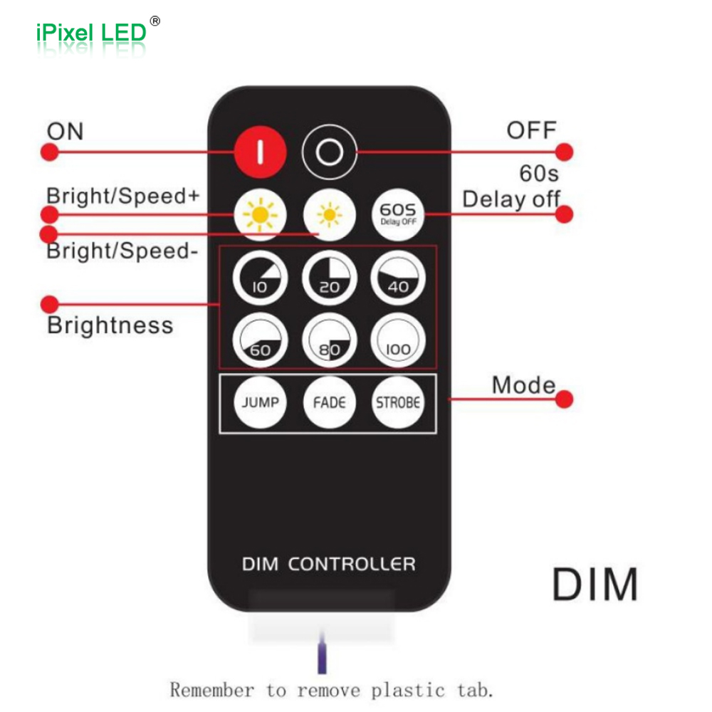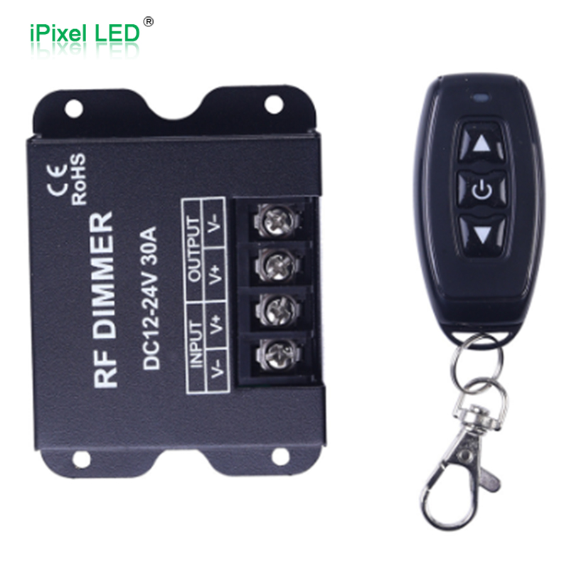 30A knob Dimmer is a dedicated intelligent LED lighting dimmer controller which is adopt the most advanced PWM (Pulse Width Modulation) digital dimming technology, It has the advantages of high power load, soft dimming, noiseless, no flicker and stable performance etc. Users not only can through the knob of dimmer achieve step-less dimming but also can use RF14 keys remote to turn on/turn off light, choose 10%-20%-40%-60%-80%-100% different brightness directly, set different lighting modes, 60s delay off turn off light etc. Is used to control a variety of led lamps as the light source, for instance, point source of light, flexible light strip and so on
