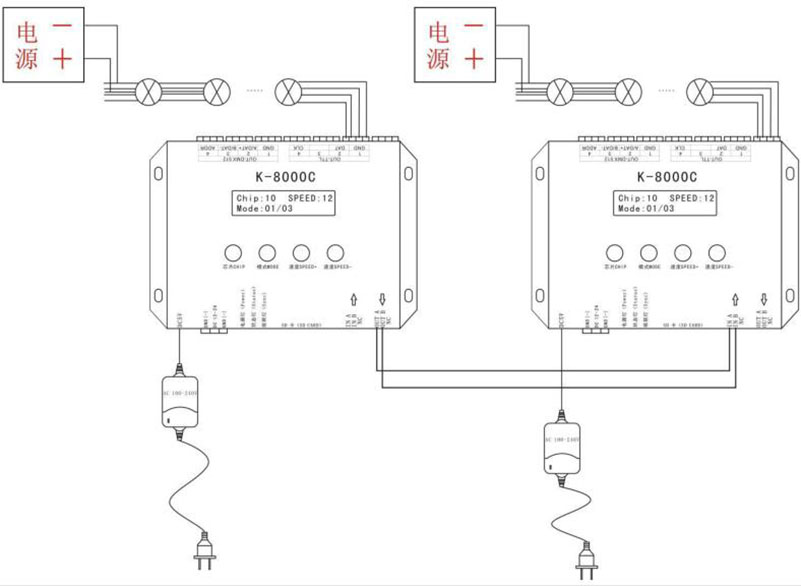 5、The controller can single set use,also multiple controllers cascade, cascade optical isolation mode: interference, better stability, cascade distance between two controllers can reach up to 150 meters, need to use 0.5M² pure copper power cord.
