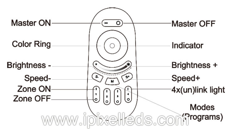 TO dim all RGBW lights at once or change the color ,first press ‘Master ON’.To do this with individual lights,first press‘Zone ON’.Secondly,choose the color or brightness according to the color ring or brightness ring.