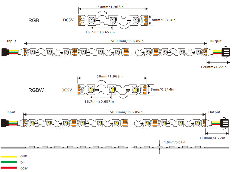 SMD5050 RGB/RGBW 60LEDs/m, 5m in a reel, and 3LEDs per section (Cut-able)